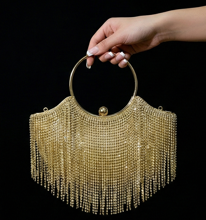 Get the perfect party look with this Gold Ring Bag. It features a stunning gold metal handle and beautiful crystal fringe that shines with every move. This golden clutch is simple yet luxurious, making it the ideal choice for weddings and special nights.