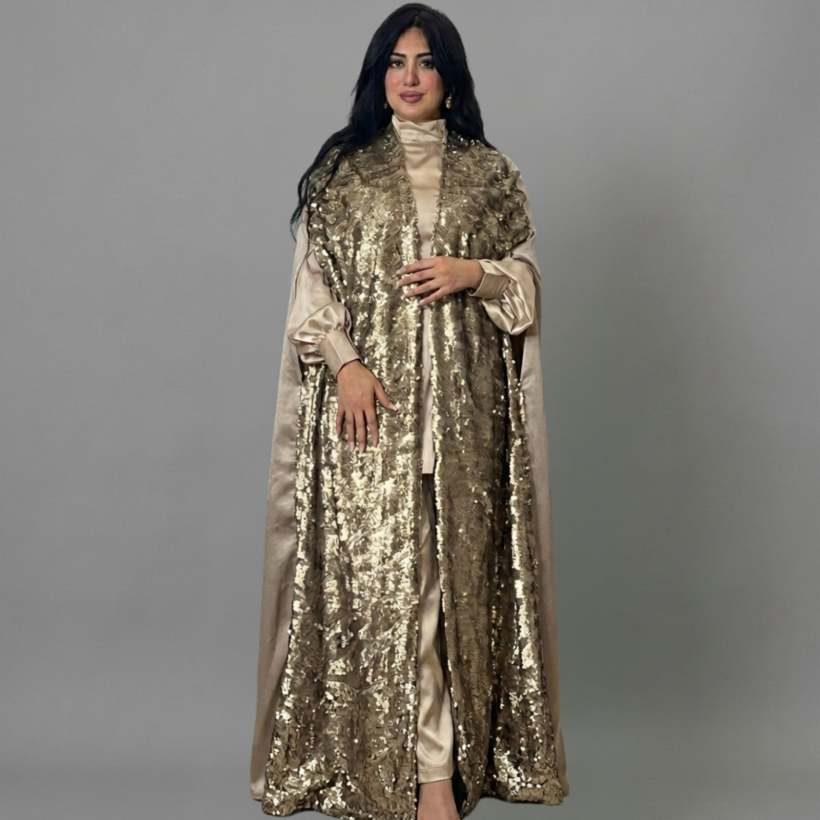 علاوة على ذلك، تم تزويد هذه العباية بتطريز كامل من الترتر الذهبي الفاخر. لأن هذا التطريز يعكس الضوء ببراعة شديدة مع كل حركة تقومين بها. ومن ناحية أخرى، تمنحكِ هذه العباية بريقاً لا مثيل له في أرقى السهرات. نتيجة لذلك، تعتبر أجمل عباية سواريه تضفي لمسة من السحر على إطلالتكِ الخاصة.