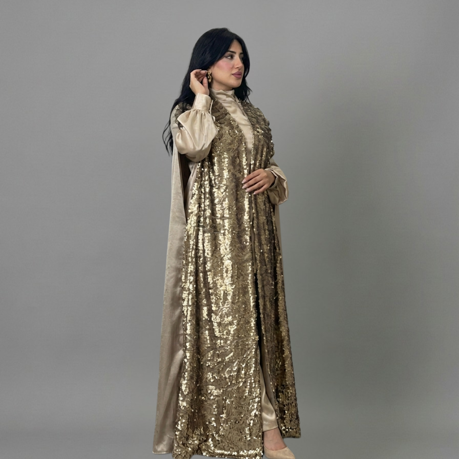 Moreover, this abaya is provided with full embroidery of premium golden sequins. Because this embroidery reflects light brilliantly, it enhances your presence. On the other hand, this abaya gives you unparalleled glamour in the finest evenings. As a result, it is considered the most beautiful Soiree Abaya for a special look.