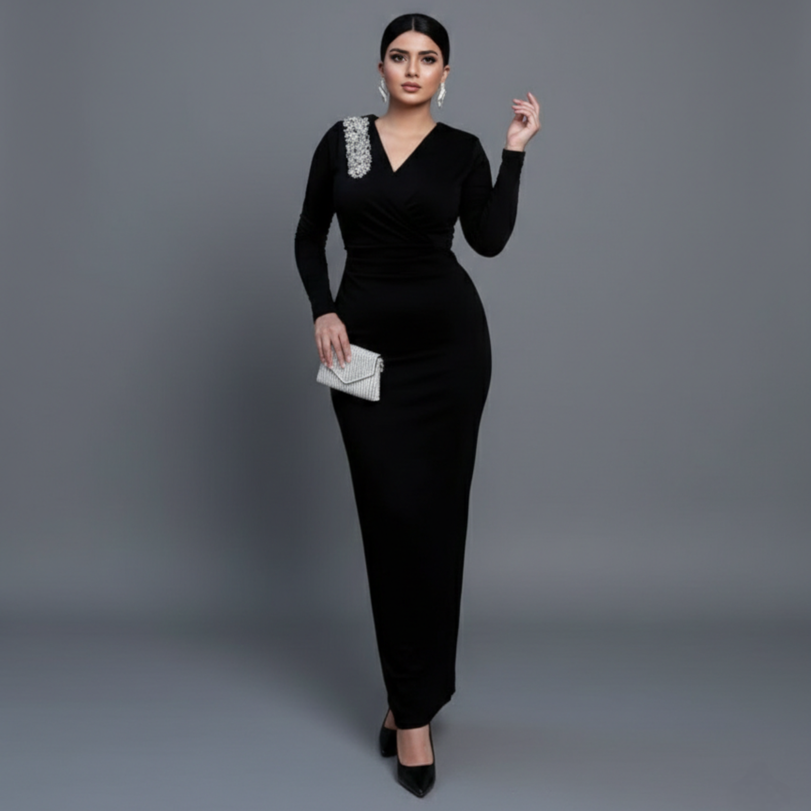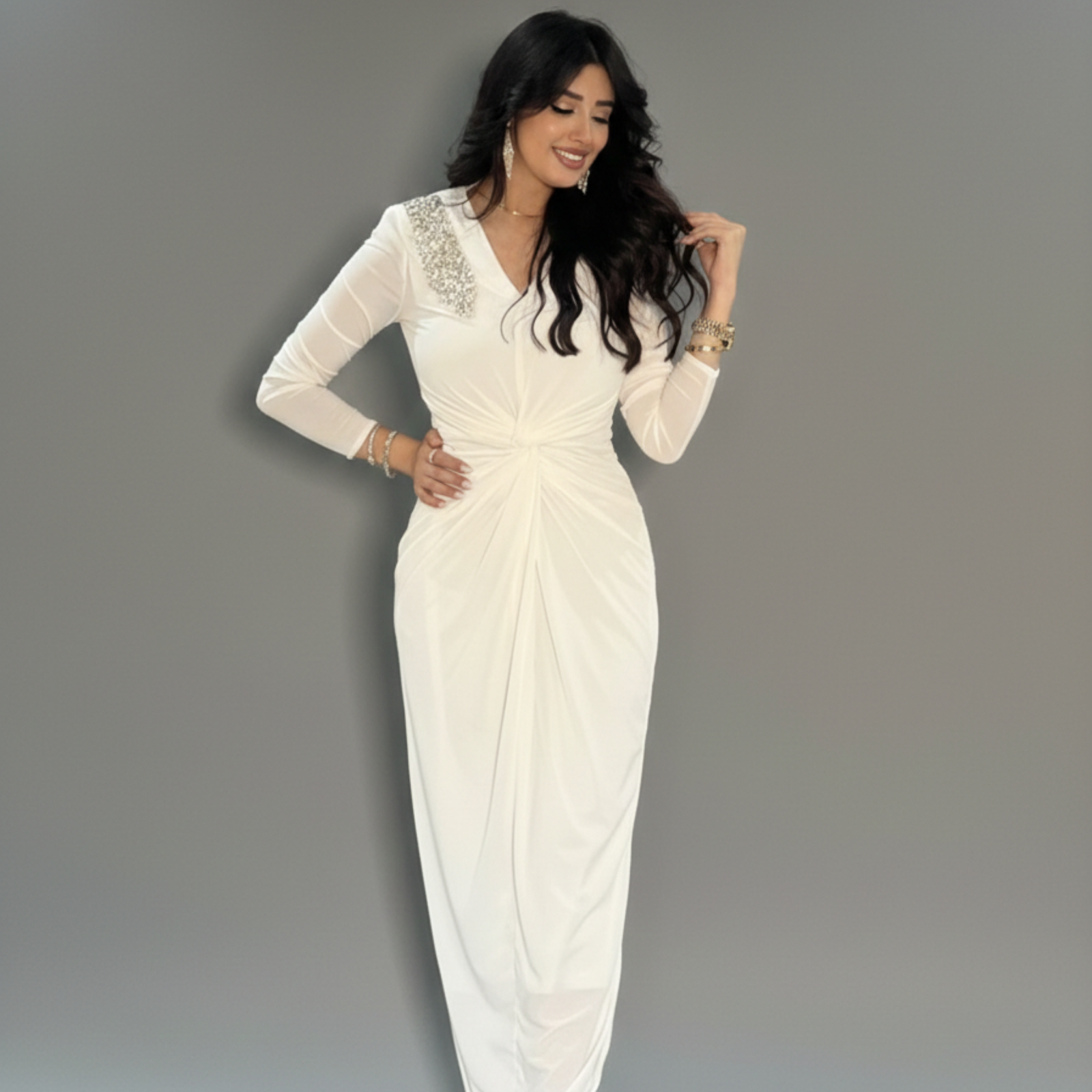 Experience the essence of modern luxury with our “Embellished Knot” dress. As one of the most sophisticated Soiree Dress Styles, it features a sleek bodycon silhouette and exquisite shoulder embroidery. Furthermore, the artistic front-knot detail is designed to enhance your natural grace; consequently, making it a perfect choice for weddings and engagement parties.