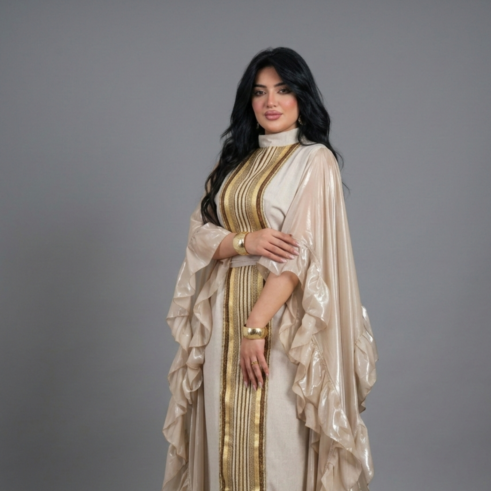 Experience the essence of elegance with our “Royal Golden Kaftan.” Furthermore, this piece features a shimmering fabric with artistic ruffled sleeves. Consequently, the flowing silhouette is designed to enhance your grace; moreover, making it the perfect choice for high-end gatherings.