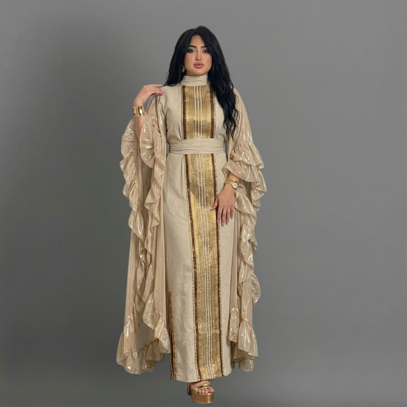 • قفطان ذهبي ملكي بأكمام كشكشة وتصميم فاخر من براند Matching